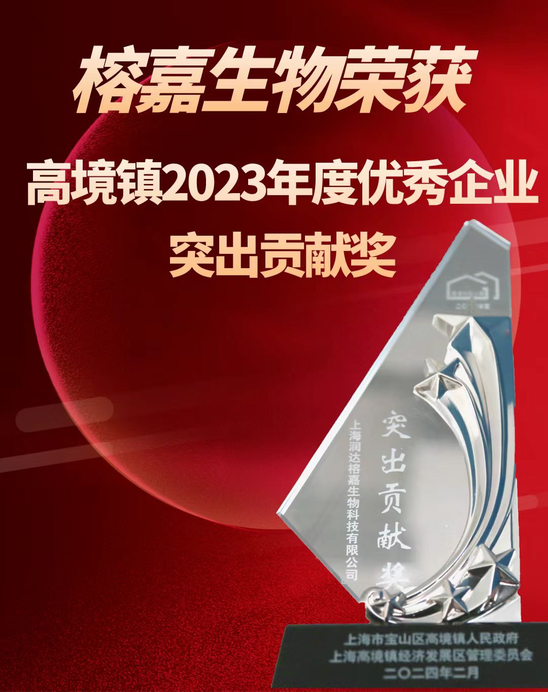 榕嘉生物榮獲高境鎮2023年度優秀企業突出貢獻獎
